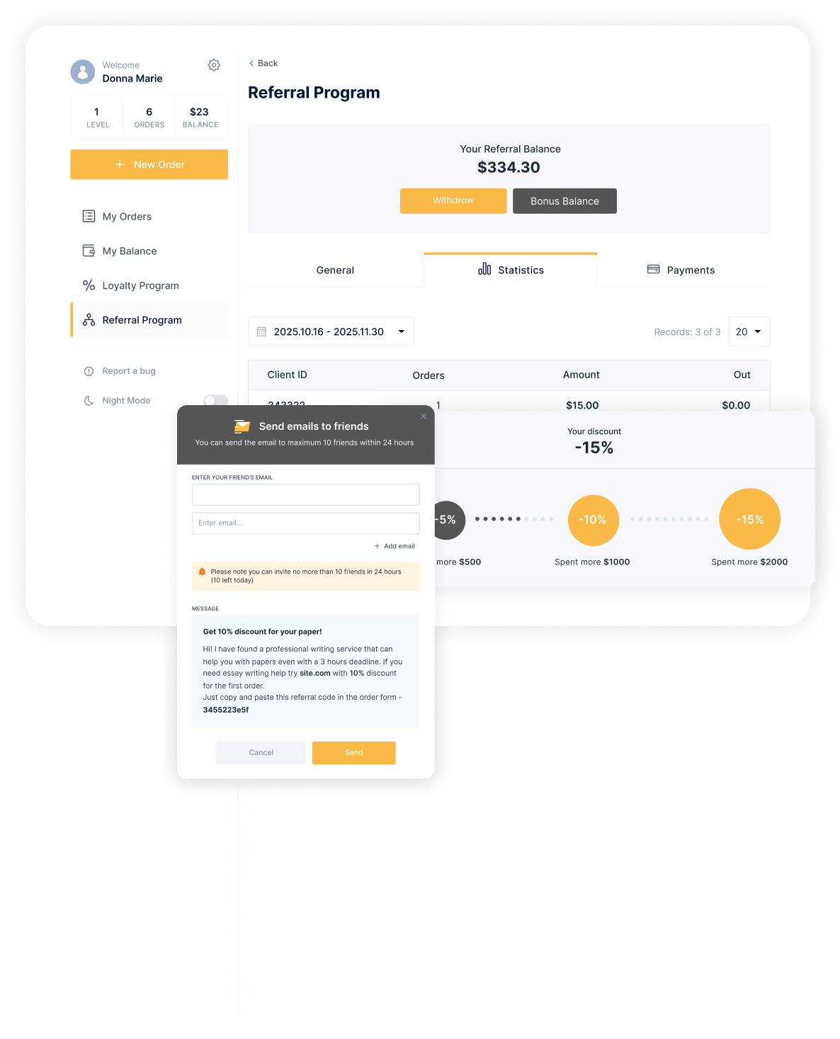 When you refer a friend to essayoneday, you’ll earn 10% from every paid and completed order they make. It’s an ongoing reward, not just a one-time bonus. Support your friends and enjoy continuous earnings at the same time.